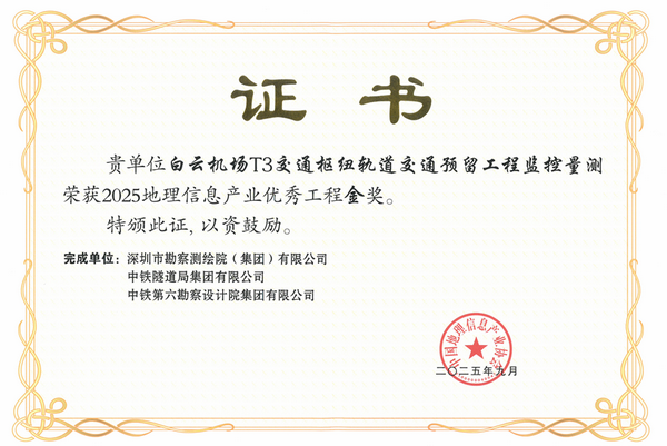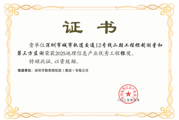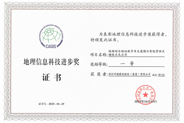 深勘集團(tuán)榮獲2025地理信息產(chǎn)業(yè)百強(qiáng)企業(yè)(第41名);深勘集團(tuán)參與申報(bào)的“鐵路綜合樞紐數(shù)字孿生建模與智能管理關(guān)鍵技術(shù)及應(yīng)用”榮獲2025地理信息科技進(jìn)步獎一等獎,組織申報(bào)的4項(xiàng)工程榮獲“兩金一銀一銅”,其中“深圳市城市軌道交通16號線工程建設(shè)周期第三方測量”獲2025年優(yōu)秀測繪工程金獎,“白云機(jī)場T3交通樞紐軌道交通預(yù)留工程監(jiān)控量測”獲2025地理信息產(chǎn)業(yè)優(yōu)秀工程金獎,“深圳市城市軌道交通12號線二期工程控制測量和第三方監(jiān)測”、“廣東省惠東縣河湖管理范圍劃定項(xiàng)目”分別獲2025地理信息產(chǎn)業(yè)優(yōu)秀工程銀獎和銅獎。