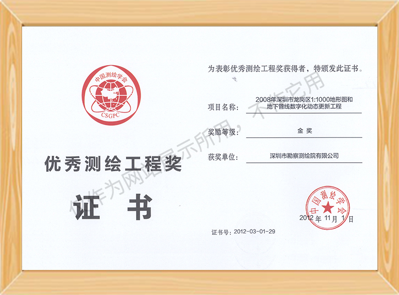 2012年優(yōu)秀測繪工程獎-金獎-2008年深圳市龍崗區(qū)1:1000地形圖和地下管線數(shù)字化動態(tài)更新工程
